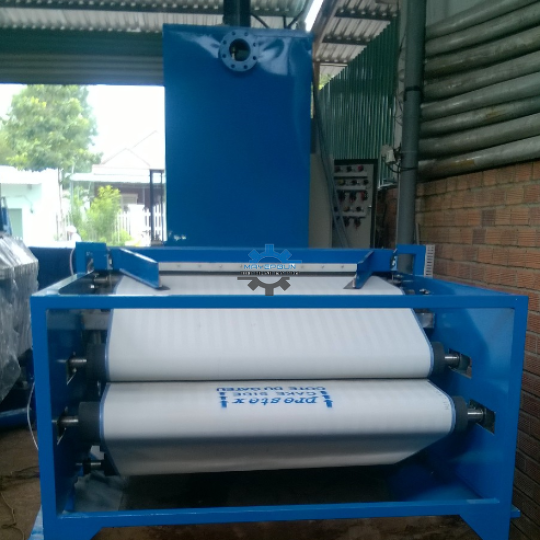- Nước thải sẽ thấm qua tấm vải lọc của băng tải, sau đó được đưa về bể chứa nước thải và sẽ được xử lý trước khi thải ra môi trường. Phần bùn thải sẽ được ép khô hơn (đạt từ 70-85%).